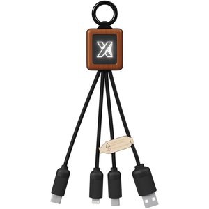 Cable de madera FSC 3 en 1 de 20 W con logotipo retroiluminado y 3 conectores (tipo C, micro USB y iPhone) o cordones hechos de plástico reciclado PET. El cable puede cargar hasta 3 dispositivos al mismo tiempo. Patente EUROPA EUIPO.