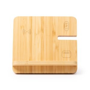 Soporte cargador vertical 3 en 1 realizado en bambú, con 15W de potencia.
