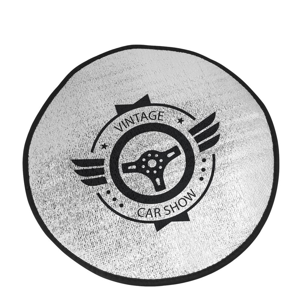 Cubre volante redondo con capa frontal de aluminio y parte trasera de espuma blanca. Ribete en color negro. Presentación en plano.