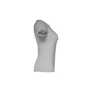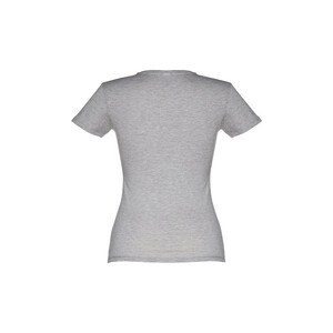 Camiseta entallada para mujer en punto jersey de algodón 100% (150 g/m²) con hilo de algodón cardado (color 183: 90% algodón/10% viscosa, color 196: 98% algodón/2% viscosa). Tiene un fino cuello de punto doble con cinta de refuerzo de raso. Pieza cortada y cosida con doble costura en mangas y bajo